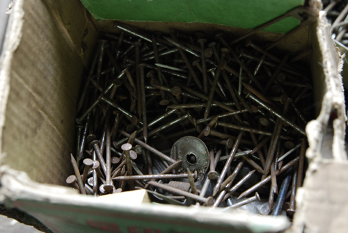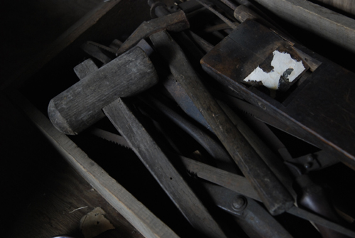 例えば、大小様々な釘、ネジ、木材、金具、金槌、木槌、鉈、ノコギリ、ノミ、ヤスリ、カンナ、定規、スコヤ、砥石、塗料、接着剤、錐、ドライバー、墨壺 etc