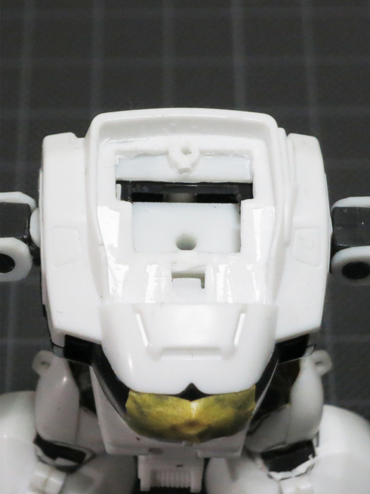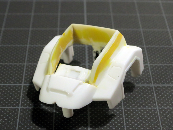 続いて、胴体側の首周りのカバー(以下 襟)の内側に1mmプラ板(左写真 塗りつぶし部分)を貼り、さらにエポパテ(黄色部分)を盛り付けてから整形し、襟の高さを約2mm延長しました。(右)。