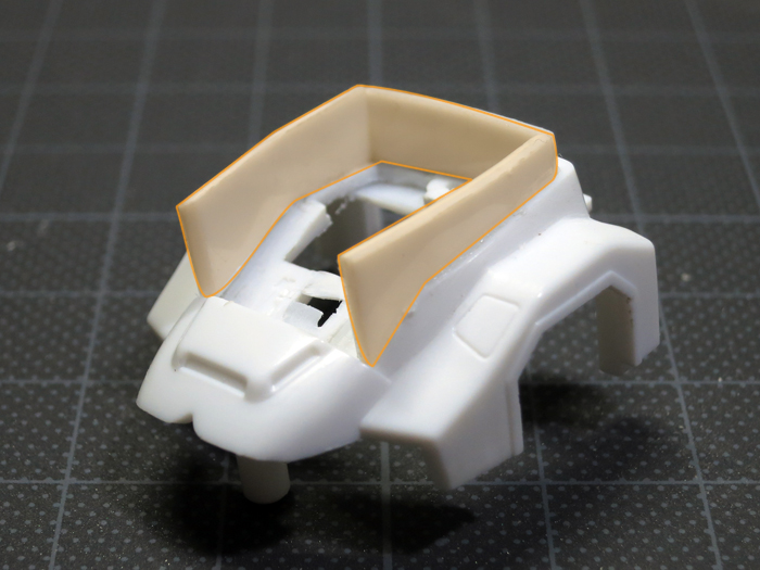 まずは首まわりですが、下の写真の塗りつぶした部分を切除。開いた穴の底面にプラ板を貼り付けます。