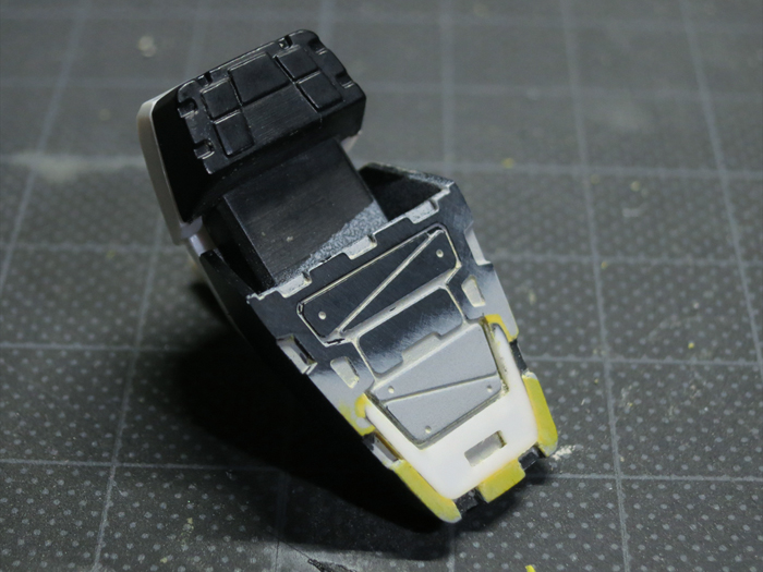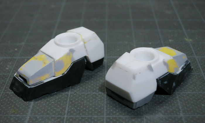 さらに、つま先のの裏側に大きな隙間があったので、プラ版(白)とパテ(黄)で下の画像のように埋めました。