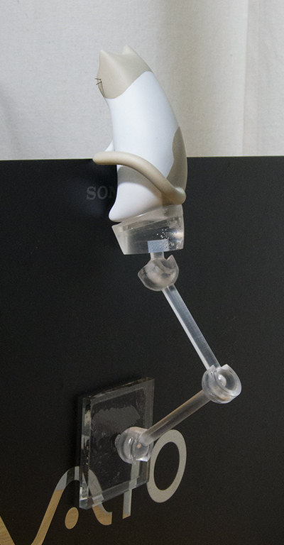 こうすることでディスプレイの形状に合わせてアームを曲げれば、多少裏面に凹凸のあったり傾斜しているディスプレイでも飾れるようにしました。
