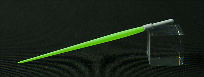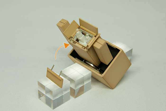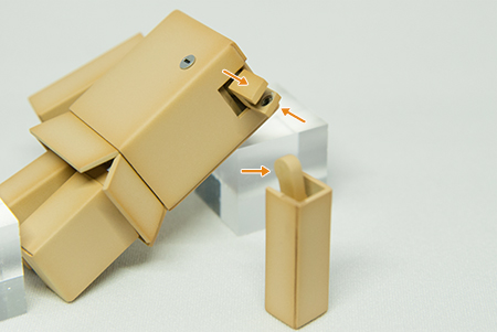そして、腕側には軸を通すために開いている穴に向きを合わせて磁石を入れれば、先のパーツの間に差し込んで磁石で固定されます。