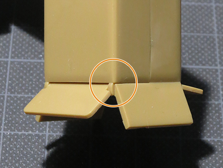 まず最初に気になったのが下記の画像の丸く囲った箇所です。胴体の前後に付いている板状のパーツ(A9)は前後に振られるようになってますが、付け根がいかにも過ぎる形状だったので付け方を以下のように変えました。(クリックすると拡大画像が見れます。)