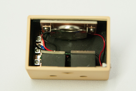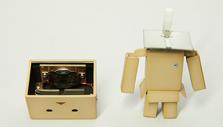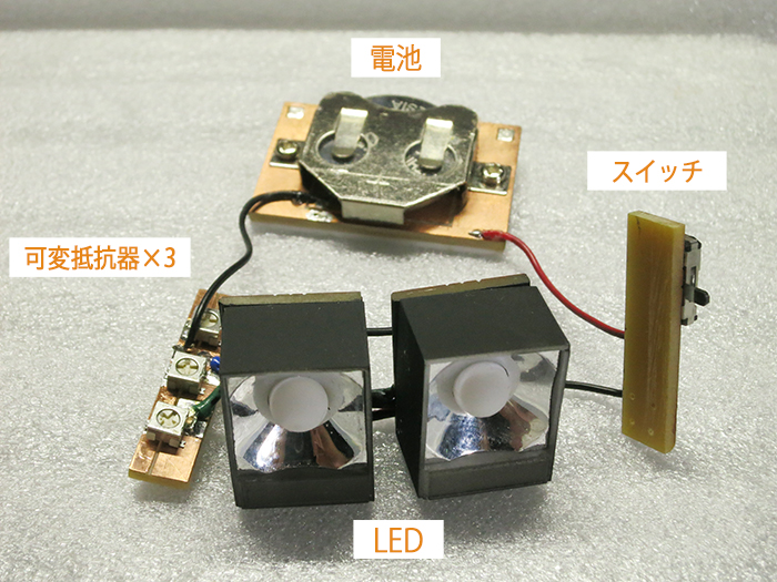 パーツ構成は手前から逆時計回り順に説明すると、左右の目を光らせるLEDが2つ、ON/OFFを切り替えるスイッチ、電源にはボタン電池、そしてLEDの発光の強弱を調整する可変抵抗器3つとなてっています