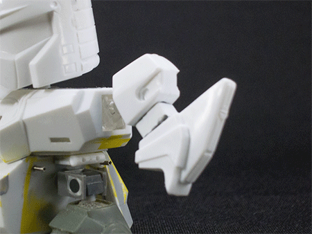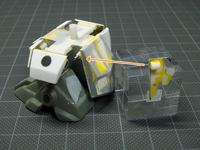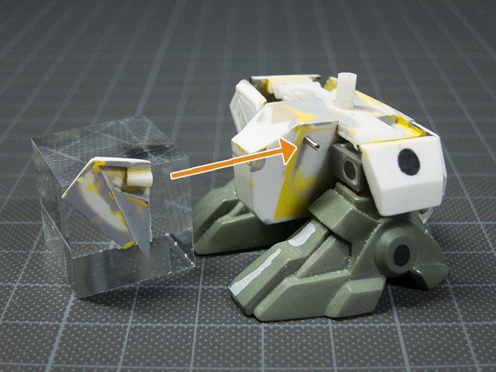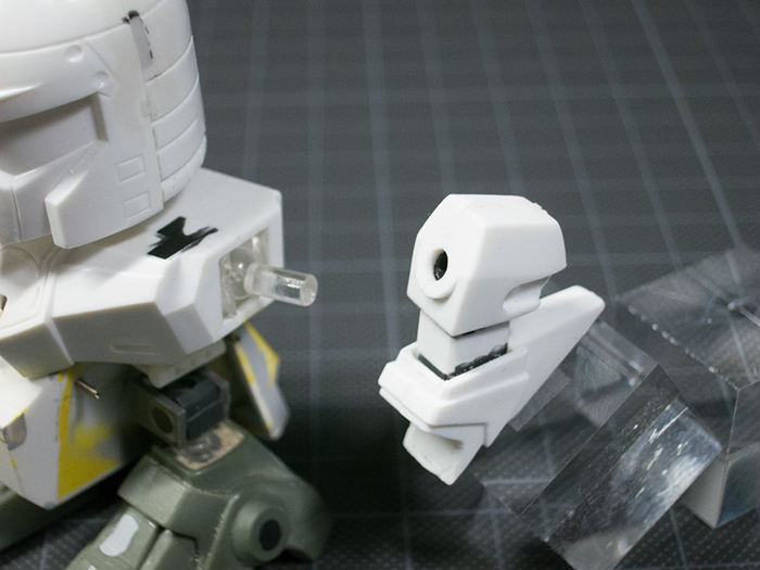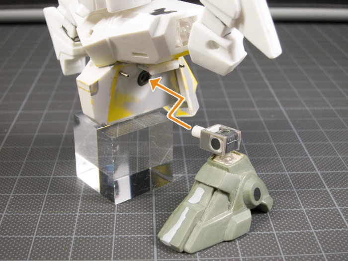 肩関節(上記画像 上)はもともとあった軸とポリキャップをカットし、胴体側にボールジョイント、腕側はポリキャップを埋め込みそれぞれ可動させました。