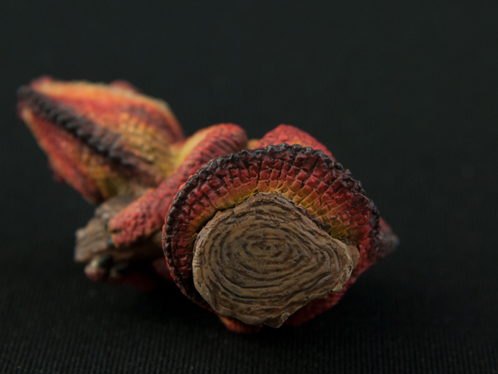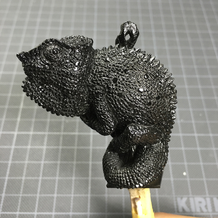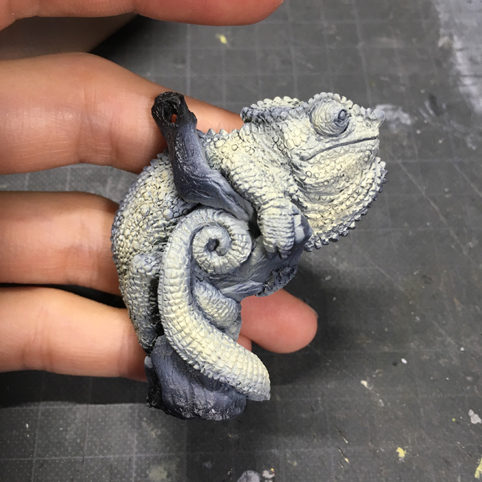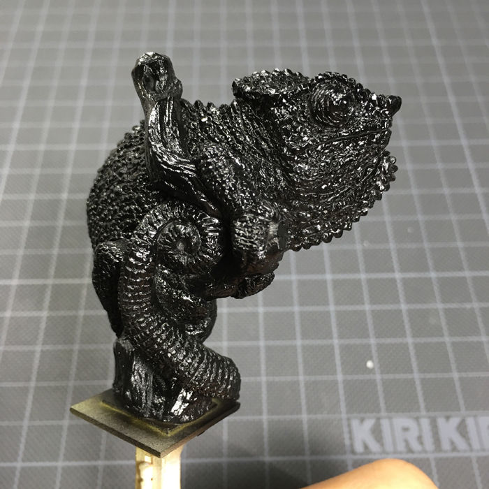 以上の工程を何度か繰り返した後、背中や顎、頭部の突起部分と爪に黒系を塗ってから全体にツヤ消しを吹きました。