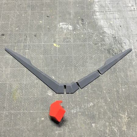 先に述べたように肩アーマーを手に持たせたのですが、こうすると左右の肩アーマがあると目立たなかった角が妙に長く見えてしまいました。