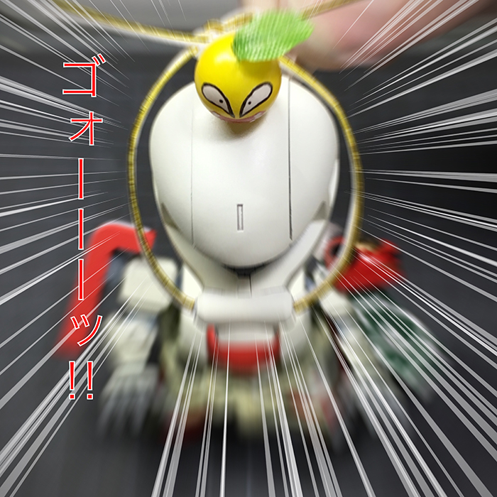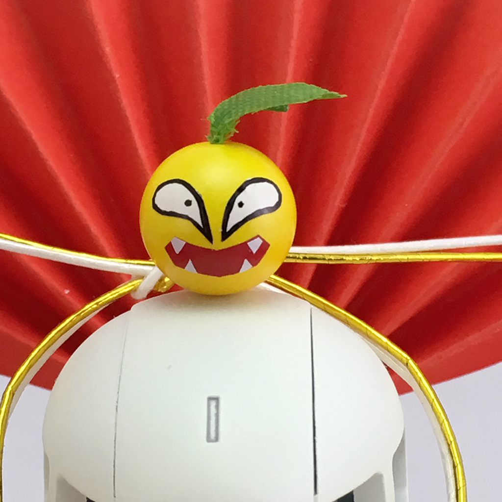 そして餅の上の蜜柑はこれまた100均で買ってきた球形のビーズを蜜柑の色に塗り、ついでにザクレロの顔を描き、ビーズの穴と頭部に軸を通して固定しました。