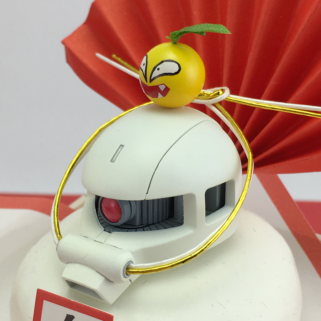 今作を作るきっかけになったのは昨年末に私が100円ショップに行った時です。店内で小さな鏡餅の置物見た時、そのお餅の楕円状の形状とザクの頭部が私の脳内で置換されました。